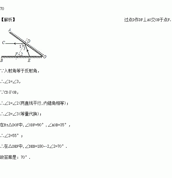 如图,∠AOB的两边OA、OB均为平面反光镜,∠AOB=35°,在OB上有一点E,从E点射出一束光线经OA上的点D反射后,反射光线DC恰好与OB平行,光线经过镜子反射时, ∠ADC=∠ODE,则∠DEB=____°.