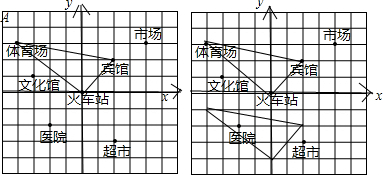 解:(1)以火车站为原点建立平面直角坐标系,如左图;