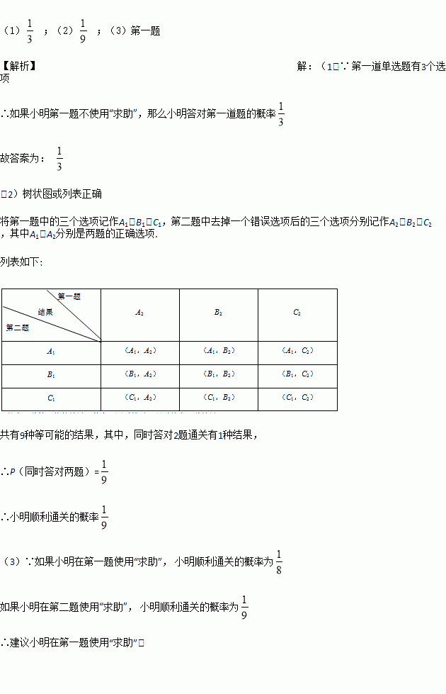 (1)如果小明第一题不使用“求助”,那么小明答对第一道题的概率是__________.