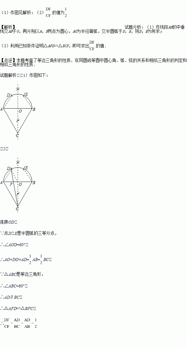 (1)请用直尺和圆规作该半圆的三等点D、E;(要保留作图痕迹,不写作法与证明)