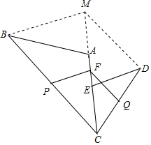 分析 (1)延长FA.使AM=EC,连接BM、MD,根据三角形的中位线定理可得出PF∥BM、FQ∥MD、BM=2PF、MD=2FQ,由∠BAC=∠CED可得出∠BAM=∠MED,再根据等腰三角形的性质可得出AB=EM、AM=ED,由此利用全等三角形的判定定理SAS可证出△ABM≌△EMD,根据全等三角形的性质可得出BM=MD,进而可证出FP=FQ;