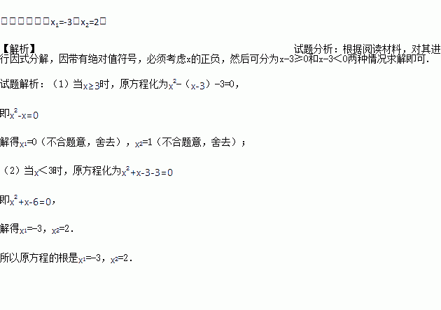 请参照例题解方程:x2-|x-3|-3=0