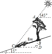 如图,在一坡角为15°的斜坡上有一棵树,高为AB(AB与水平线垂直),当太阳光与水平线成45°角时,测得该树在斜坡上的树影BC的长为8米,求树高AB.(结果保留根号)