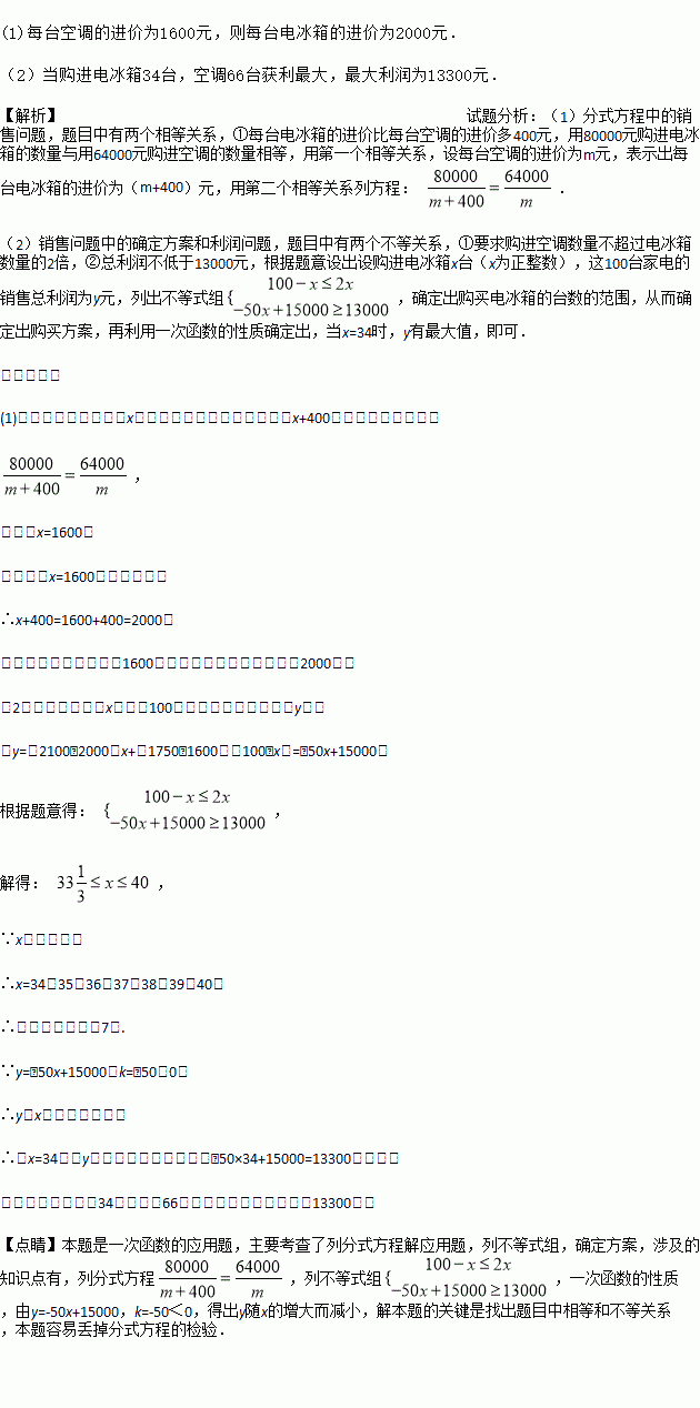 某家电销售商城电冰箱的销售价为每台2100元,空调的销售价为每台1750元,每台电冰箱的进价比每台空调的进价多400元,商城用80000元购进电冰箱的数量与用64000元购进空调的数量相等.