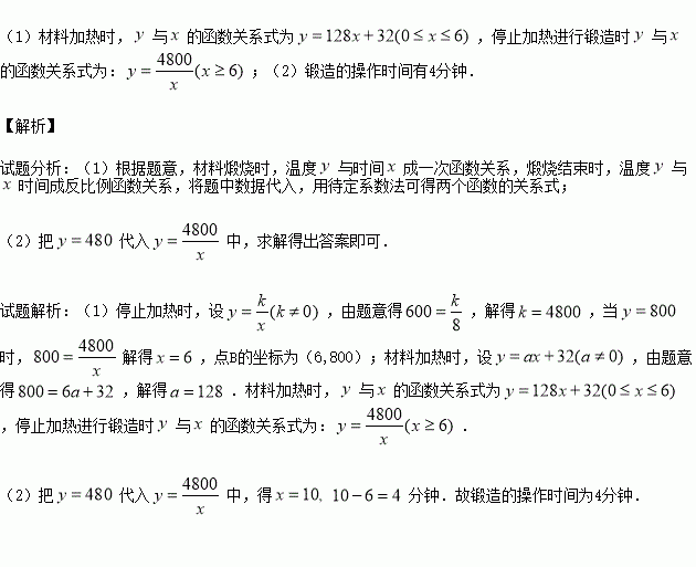 工匠制作某种金属工具要进行材料煅烧和锻造两个工序,即需要将材料烧到800℃,然后停止煅烧进行锻造操作,经过8min时,材料温度降为600℃.煅烧时温度y(℃)与时间x(min)成一次函数关系;锻造时,温度y(℃)与时间x(min)成反比例函数关系(如图).已知该材料初始温度是32℃.