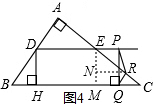 (4)画出图形,根据图形进行讨论:①当PQ=PR时,过点P作PM⊥QR于M,则QM=RM.由于∠1+∠2=90°,∠C+∠2=90°,得到∠1=∠C.于是得到cos∠1=cosC=$\frac{8}{10}$=$\frac{4}{5}$,根据$\frac{QM}{QP}$=$\frac{4}{5}$,即可求出t的值;②当PQ=RQ时,-$\frac{3}{5}$t+$\frac{123}{25}$=$\frac{12}{5}$,即可求出t的值;③当PR=QR时,则R为PQ中垂线上的点,于是点R为EC的中点,故CR=$\frac{1}{2}$CE=$\frac{1}{4}$AC=2.由于tanC=$\frac{QR}{CR}$=$\frac{BA}{CA}$,即可得到结果.