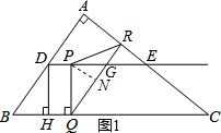 (2)根据D,E分别是边AB,AC的中点,得到DE∥BC,得到四边形BQGD是平行四边形,于是得到当BD=BQ时.?BQGD是菱形,即可得到t的值,如图1,过P作PN⊥QR于N,由△PQN∽△ABC,求得PN=$\frac{36}{25}$,由△CQR∽△CBA,求得RQ=$\frac{21}{5}$,即可得到结果;