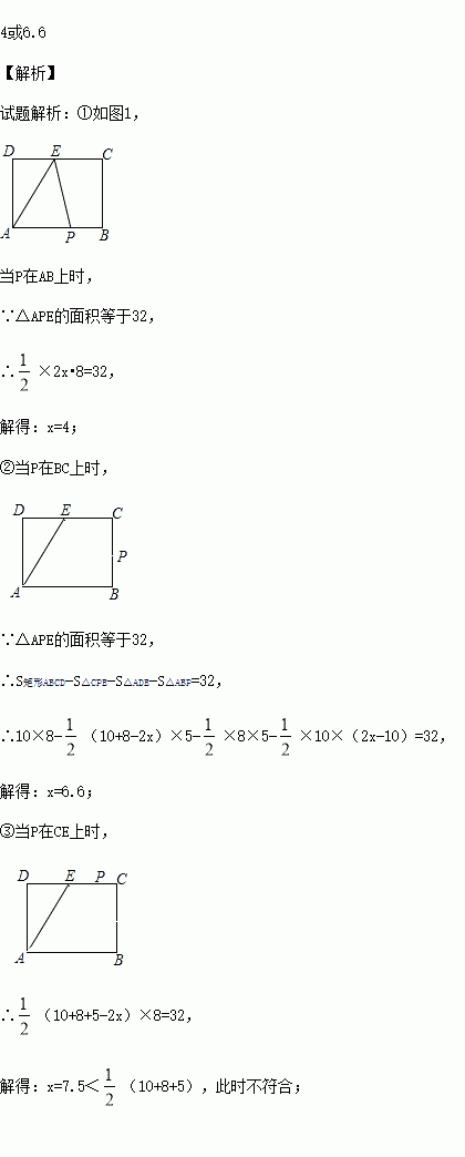 如图,长方形ABCD中,AB=10cm,BC=8cm,点E是CD的中点,动点P从A点出发,以每秒2cm的速度沿A→B→C→E运动,最终到达点E.若点P运动的时间为x秒,那么当x= 时,△APE的面积等于32.