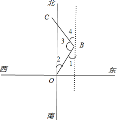 分析 (1)根据沿北偏东60°方向爬行1.1cm,可得OB,根据又从B点沿西北方向爬行1.6cm到达C处,可得BC;(2)根据内错角相等,可得∠1的度数,根据西北方向,可得∠4的度数,根据三个角的和等于180°,可得答案.
