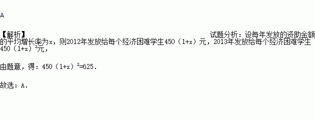 到2013底,我县已建立了比较完善的经济困难学生资助体系.某校2011年发放给每个经济困难学生450元,2013年发放的金额为625元.设每年发放的资助金额的平均增长率为x,则下面列出的方程中正确的是( )