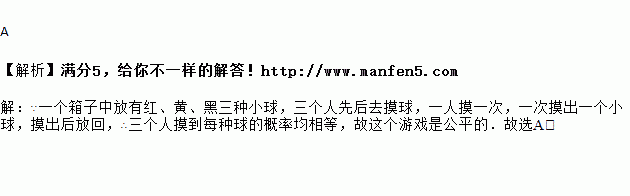 一个箱子中放有红、黄、黑三种只有颜色不同的小球,三个人先后去摸球,一人摸一次,一次摸出一个小球,摸出后放回,摸出黑色小球为赢,这个游戏是( )