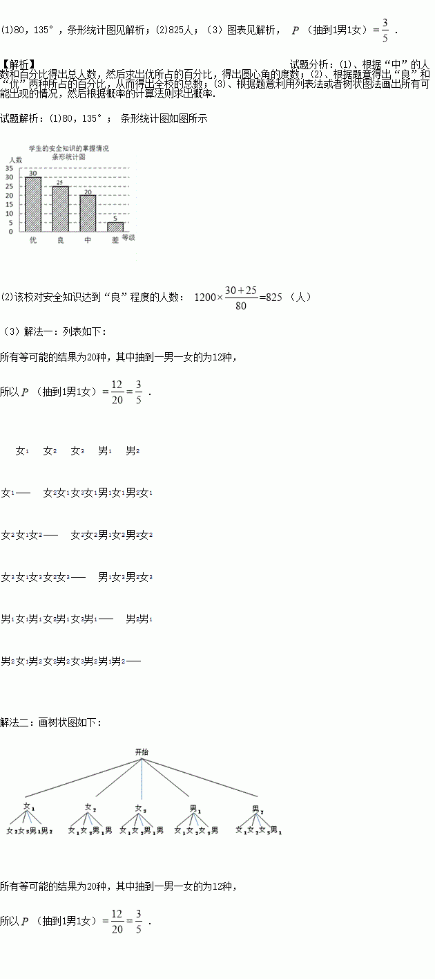 (3)测评成绩前五名的学生恰好3个女生和2个男生,现从中随机抽取2人参加市安全知识竞赛,请用树状图或列表法求出抽到1个男生和1个女生的概率.