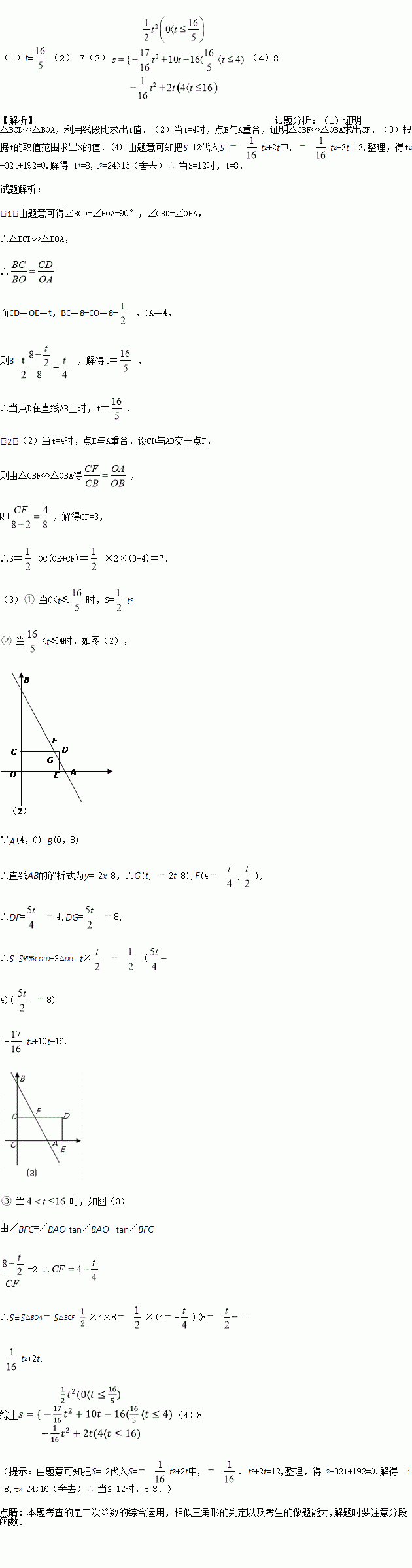如图,点A、B坐标分别为(4,0)、(0,8),点C是线段OB上一动点,点E在x轴正半轴上,四边形OEDC是矩形,且OE=2OC.设OE=t(t>0),矩形OEDC与△AOB重合部分的面积为S.根据上述条件,回答下列问题: