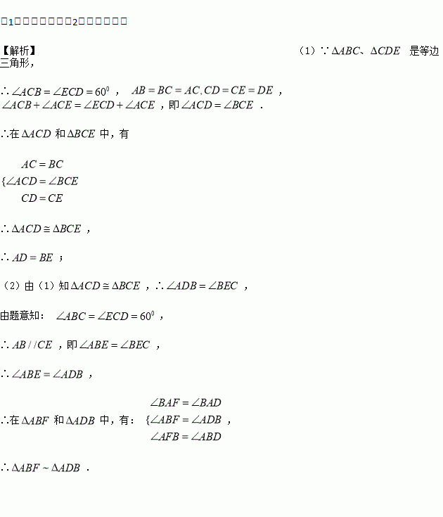 (1)求证:AD=BE; (2)求证:△ABF∽△ADB。