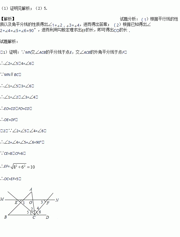 如图,点O是△ABC边AC上一个动点,过O作直线MN∥BC.设MN交∠ACB的平分线于点E,交∠ACB的外角平分线于点F.