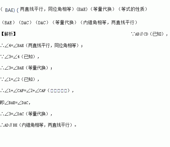 已知,如图,BCE、AFE是直线,AB∥CD,∠ 1=∠ 2,∠ 3=∠ 4.