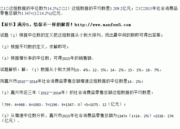 (1)求嘉兴市2010~2014年社会消费品零售总额增速这组数据的中位数.