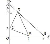 如图,在△AOB中,OA=0B=9,点C的坐标为(0,2),点P是OB上一动点,连接CP,将CP绕C点逆时针旋转90°得到线段CD,使点D恰好落在AB上,求点D的坐标.