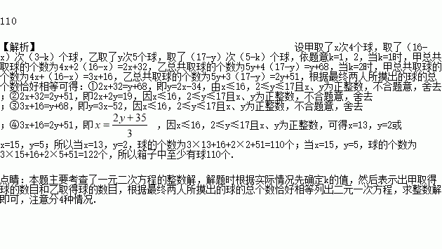 甲、乙两人玩摸球游戏,从放有足够多球的箱子中摸球,规定每人最多两种取法,甲每次摸4个或(3-k)个,乙每次摸5个或(5-k)个(k是常数,且0<k<3);经统计,甲共摸了16次,乙共摸了17次,并且乙至少摸了两次5个球,最终两人所摸出的球的总个数恰好相等,那么箱子中至少有球__________个.