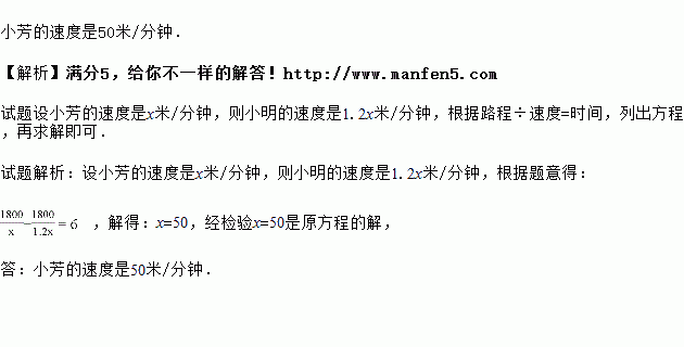 星期天,小明和小芳从同一小区门口同时出发,沿同一路线去离该小区1800米的少年宫参加活动,为响应“节能环保,绿色出行”的号召,两人都步行,已知小明的速度是小芳的速度的1.2倍,结果小明比小芳早6分钟到达,求小芳的速度.
