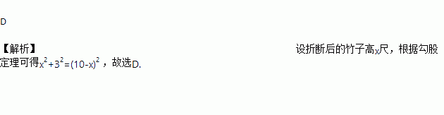 《九章算术》是我国古代的数学名著,书中的“折竹抵地”问题: 今有竹高一丈,末折抵地,去本三尺.问折者高几何?意思是:一根竹子,原高一丈(一丈=10尺),一阵风将竹子折断,其竹梢恰好抵地,抵地处离竹子底部3尺远, 问折断处离地面的高度是多少?设折断后离地面的高度为x尺,则可列方程为( )