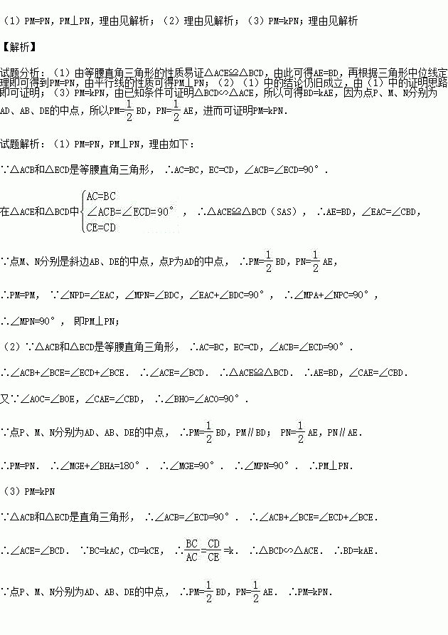 (3)若图②中的等腰直角三角形变成直角三角形,使BC=kAC,CD=kCE,如图③,写出PM与PN的数量关系,并加以证明.