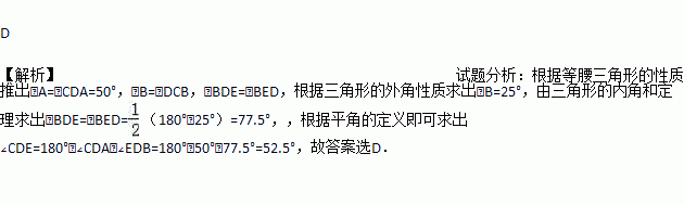 如图,△ABC中,D为AB上一点,E为BC上一点,且AC=CD=BD=BE,∠A=50°,则∠CDE的度数为( )