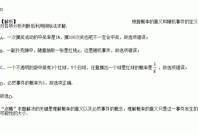 C. 一个不透明的袋中装有3个红球,5个白球,任意摸出一个球是红球的概率是