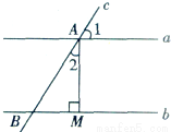 如图所示,直线a∥b,直线c与直线a,b分别相交于点A、点B,AM⊥b,垂足为点M,若∠l=58°,则∠2= ___________ .