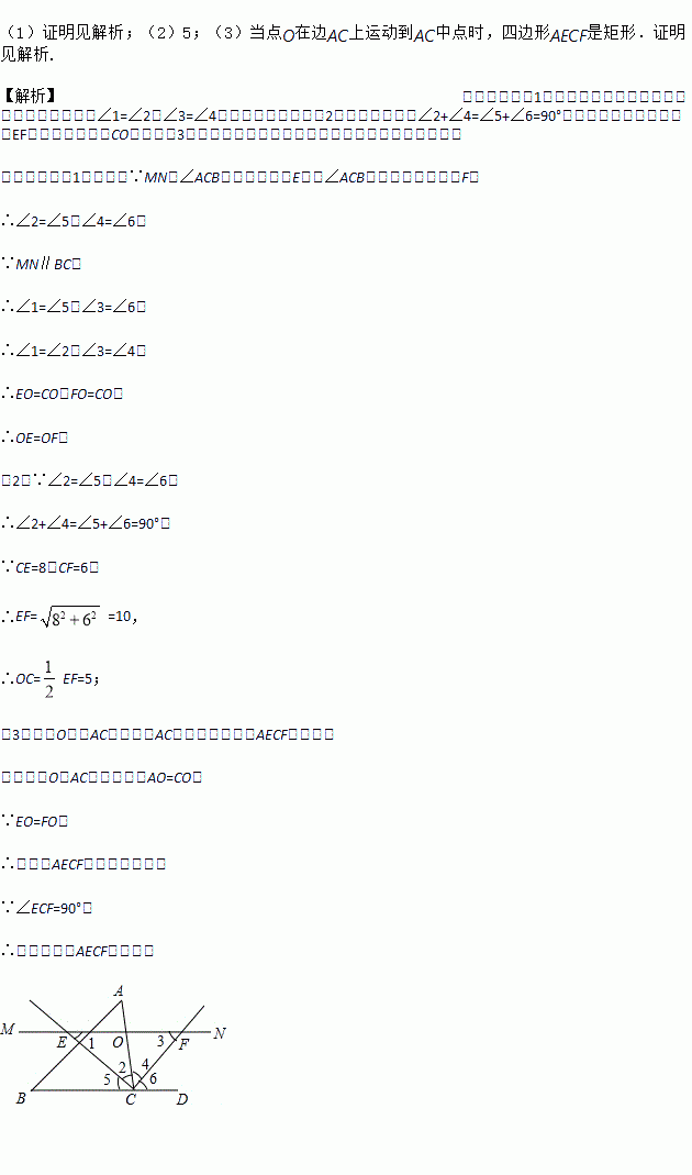 如图,△ABC中,点O是边AC上一个动点,过O作直线MN∥BC.设MN交∠ACB的平分线于点E,交∠ACB的外角平分线于点F.