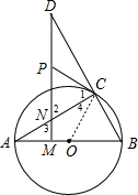 分析 (1)根据圆周角定理,由AB为直径得到∠ACB=90°,则CP是Rt△CDN的边ND上的中线,所以PC=PN=PD,根据等腰三角形的性质得∠1=∠2,由对顶角相等得∠2=∠3,则∠1=∠3,接着证明∠A=∠4,∠A+∠3=90°,于是得到∠1+∠4=90°,所以根据切线的判定定理可得CP是⊙O的切线;