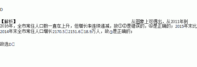 有下面四个判断:①从2011年至2016年,全市常住人口数在逐年下降; ②2010年末全市常住人口数达到近年来的最高值;③2015年末全市常住人口比2014年末增加18.9万人;④从2011年到2016年全市常住人口的年增长率连续递减。其中合理的是( )