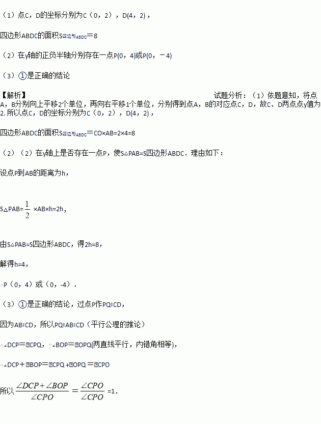 如图,在平面直角坐标系中,点A,B的坐标分别为(-1,0),(3,0),现同时将点A,B分别向上平移2个单位,再向右平移1个单位,分别得到点A,B的对应点C,D,连接AC,BD.(1)求点C,D的坐标及四边形ABCD的面积S□ABDC;(2)在y轴上是否存在一点P,连接PA,PB,使S△ABC=S□ABDC,若存在这样一点,求出点P的坐标;若不存在,试说明理由;(3)点P是线段BD上的一个动点,连接PC,PO,当点P在BD上移动时(不与B,D重合)给出下列结论:(1)