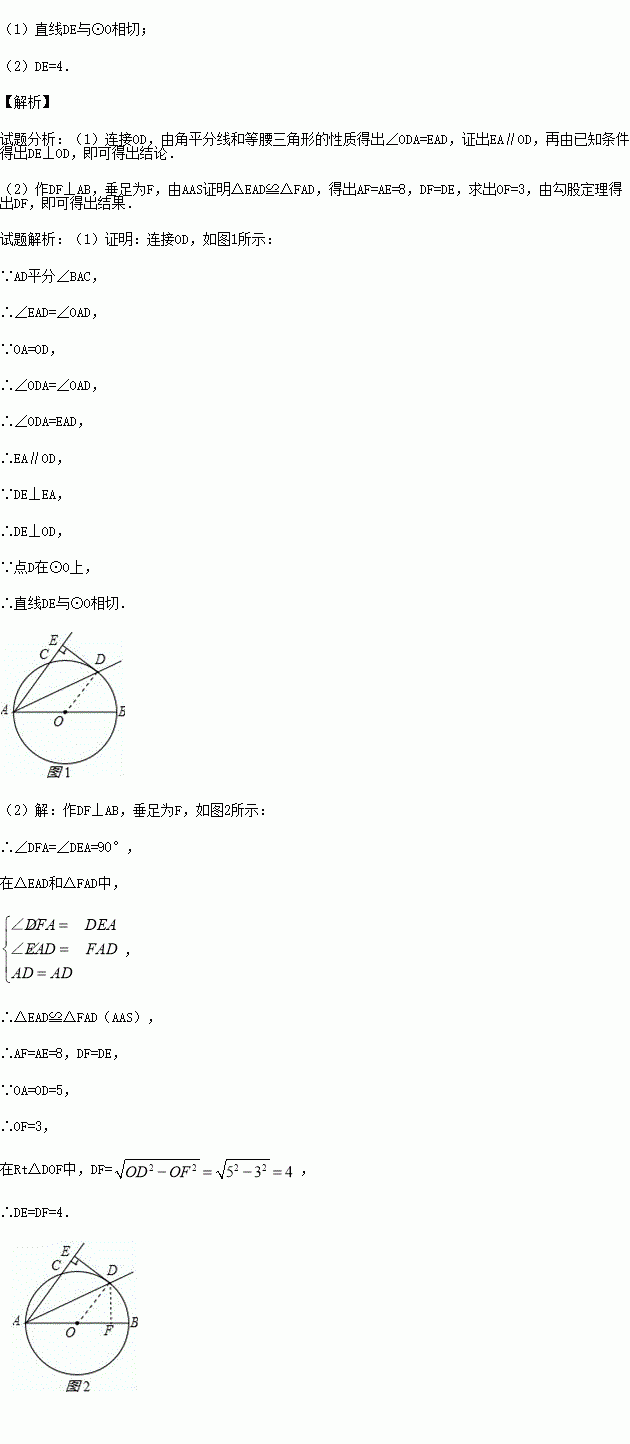 (1)若AE=8,⊙O的半径为5,求DE的长.