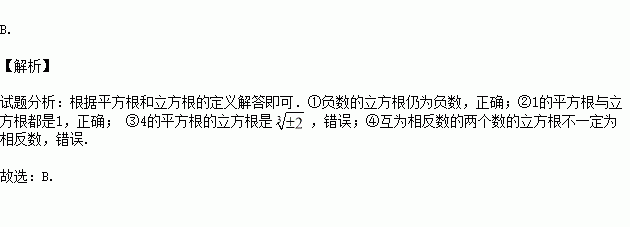 下列四种说法:①负数的立方根仍为负数;②1的平方根与立方根都是1; ③4的平方根的立方根是