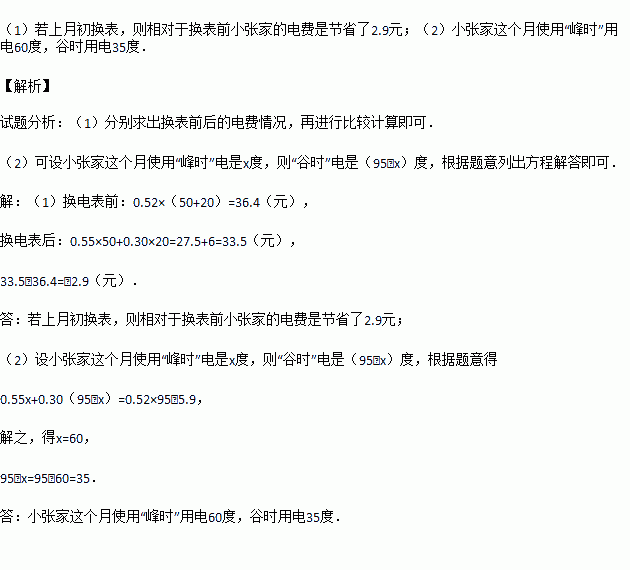 (2)小张家这个月用电95度,经测算比换表前使用95度电节省了5.9元,问小张家这个月使用“峰时电”和“谷时电”分别是多少度?