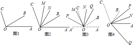 (3)如图4,射线OP从OC处以10°/分的速度绕点O开始逆时针旋转一周,同时射线OQ从OB处以相同的速度绕点O逆时针也旋转一周,OM平分∠POQ,ON平分∠POA,求多少分钟时,∠MON的度数是30°?【注:本题所涉及的角都是小于180°的角】