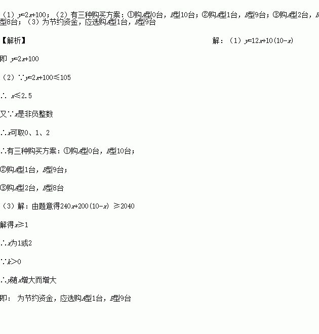 为了保护环境,某企业决定购买10台污水处理设备,现有A、B两种型号的设备,其中A种型号的设备每台价格为12万元,B种型号的设备每台价格为10万元;A种型号的设备每台每月可以处理污水240吨,B种型号的设备每台每月可以处理污水200吨,经预算,该企业购买设备的资金不高于105万元.