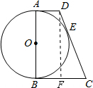 分析:由∠A=∠B=90°,利用切线的性质得到AD与BC都与圆O相切,再由CD与圆相切,利用切线长定理得到AD=DE,CE=CB,可得出CD=DE+CE=AD+BC,设AD=x,得到BC=4AD=4x,确定出CD为5x,作出梯形的高DF,如图所示,在直角三角形CDF中,表示出三角形三边,利用勾股定理列出关于x的方程,求出方程的解得到x的值,即可求出CD的长.