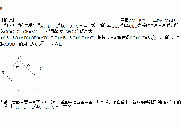 一顶点重合的两个大小完全相同的边长为3的正方形ABCD和正方形AB′C′D′,如图所示,∠DA’ D′=45°,边BC与D′C′交于点O,则四边形ABOD′的周长是( )