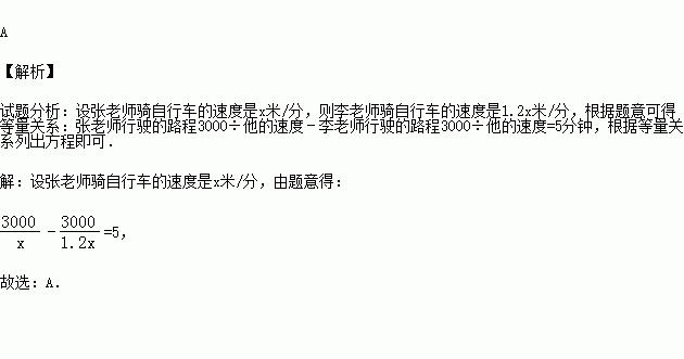 张老师和李老师住在同一个小区,离学校3000米,某天早晨,张老师和李老师分别于7点10分、7点15分离家骑自行车上班,刚好在校门口遇上,已知李老师骑车的速度是张老师的1.2倍,为了求他们各自骑自行车的速度,设张老师骑自行车的速度是x米/分,则可列得方程为( )