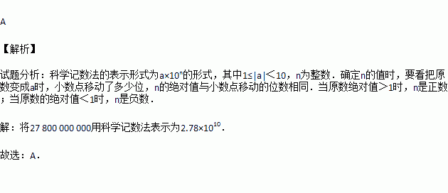 A.2.78×1010 B.2.78×1011 C.27.8×1010 D.0.278×1011