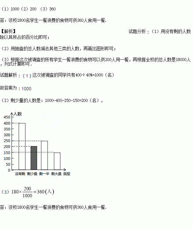 (3)校学生会通过数据分析,估计这次被调查的所有学生一餐浪费的食物可以供200人用一餐.据此估算,该校1800名学生一餐浪费的食物可供多少人食用一餐?