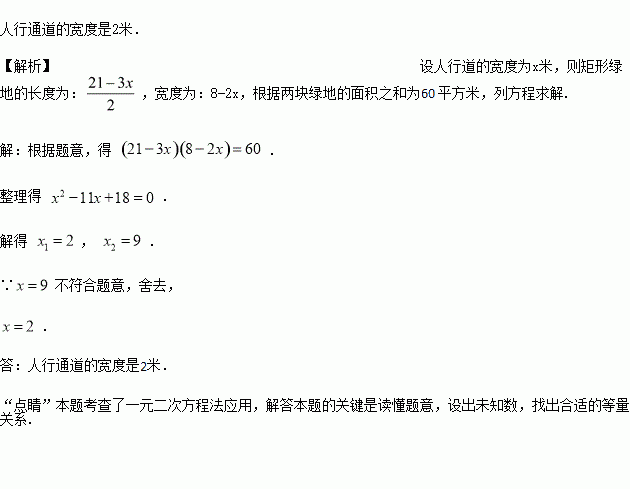 某小区有一块长21米,宽8米的矩形空地,如图所示.社区计划在其中修建两块完全相同的矩形绿地,并且两块绿地之间及四周都留有宽度为x米的人行通道.如果这两块绿地的面积之和为60平方米,人行通道的宽度应是多少米?