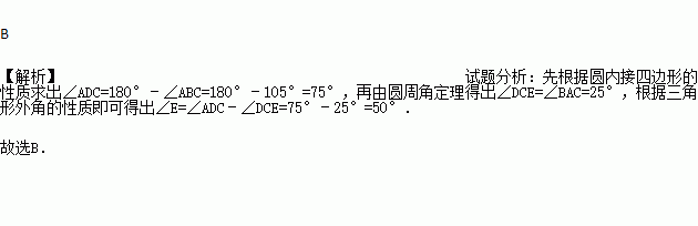 ,连接CF并延长交AD的延长线于点E,连接AC,若∠ABC=105°,∠BAC=25°,则∠E的度数为( )