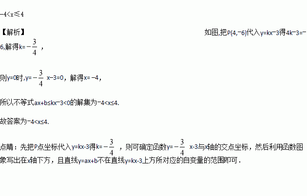 如图,已知函数y=ax+b与函数y=kx-3的图象相交于P(4,-6),则不等式ax+b≤kx-3<0的解集是_______________.