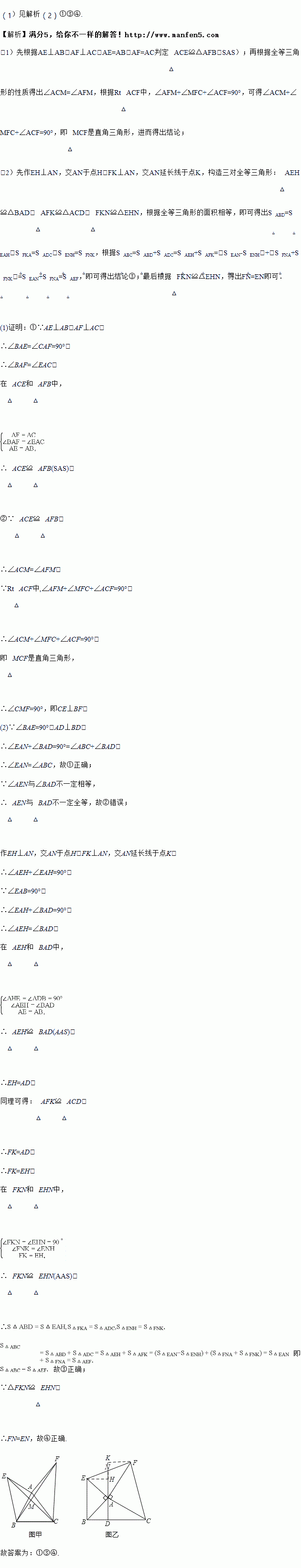 如图甲所示,已知AE⊥AB,AF⊥AC,AE=AB,AF=AC. BF与CE相交于点M