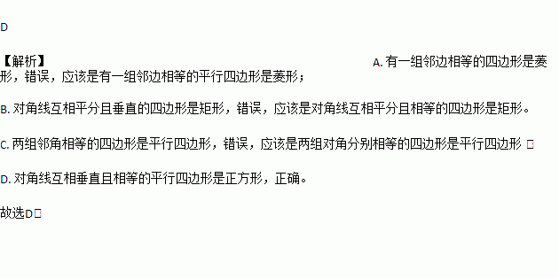 C. 两组邻角相等的四边形是平行四边形 D. 对角线互相垂直且相等的平行四边形是正方形