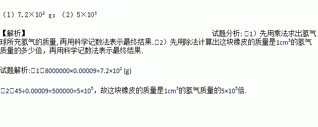 已知1cm3的氢气质量约为0.00009g.请用科学计数法表示下列计算结果.