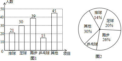 (3)在图2中,“乒乓球”所对应扇形的圆心角的度数为360°×$\frac{15}{150}$=36°;